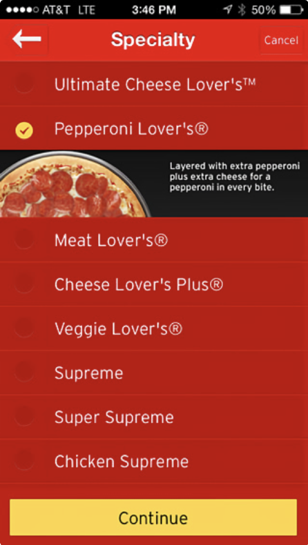 Topping descriptions should be visible without an extra click, using short labels like “EXTRA pepperoni and cheese.”