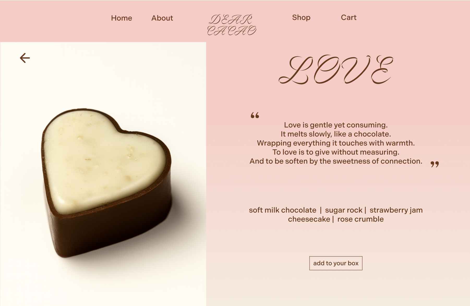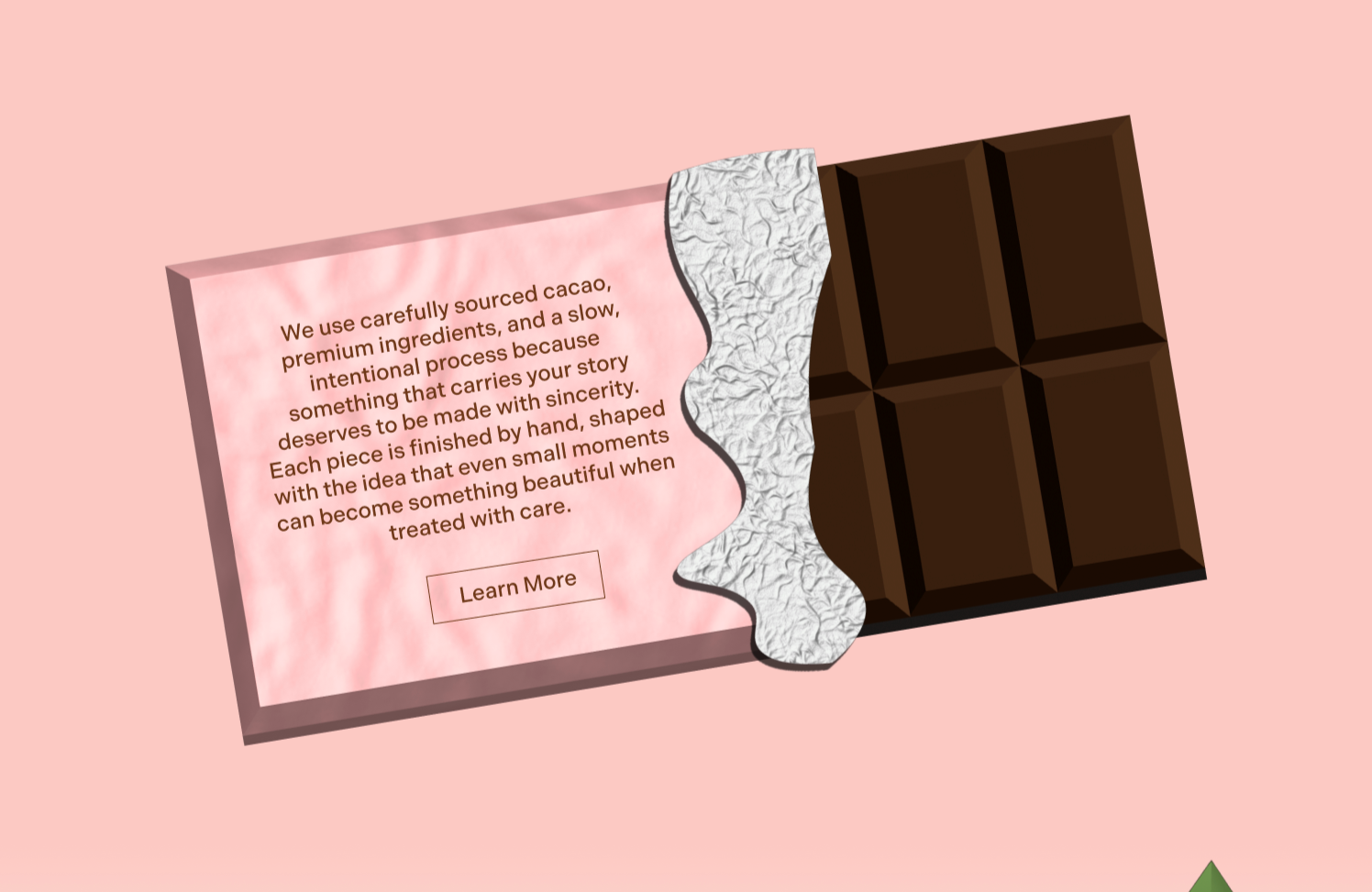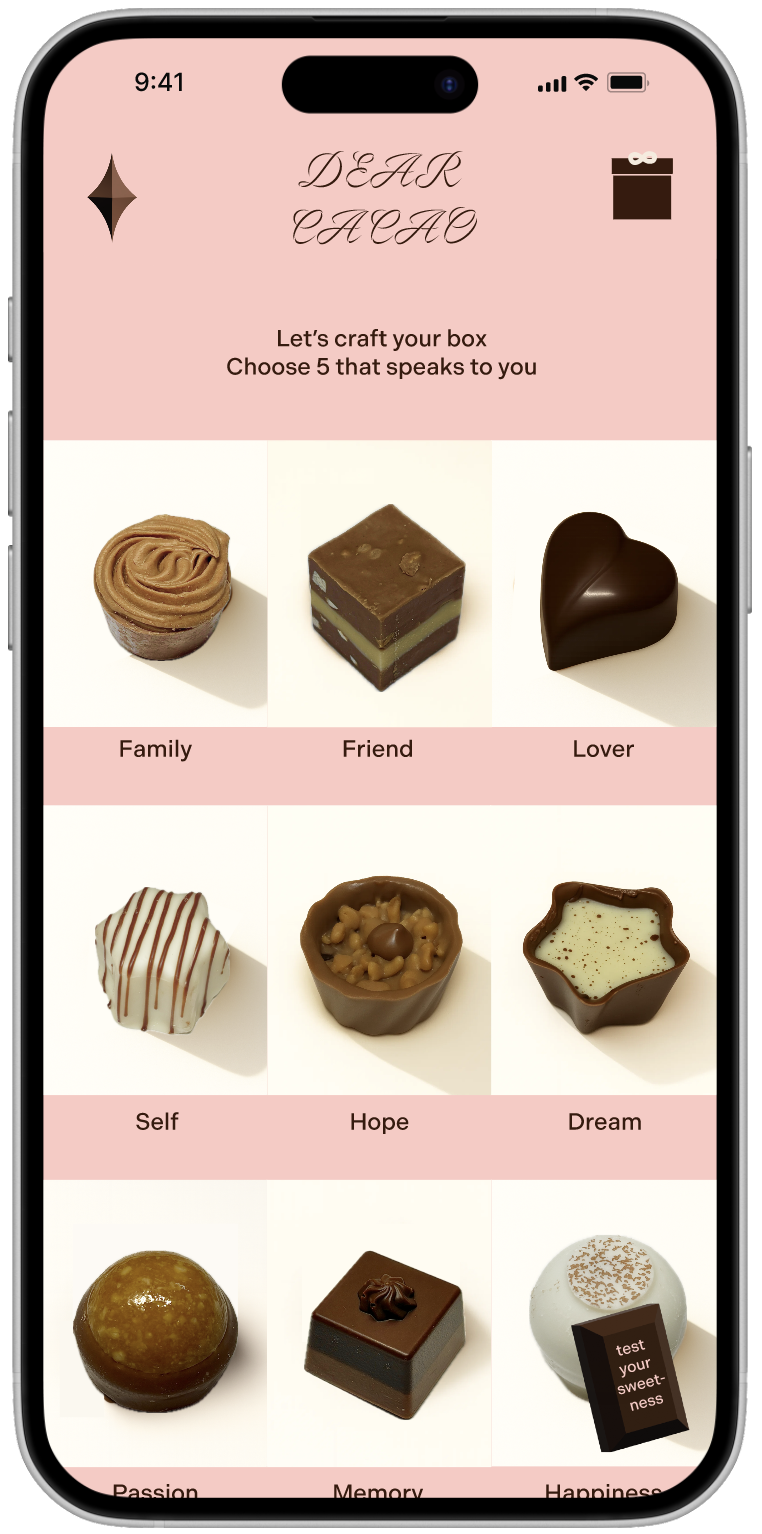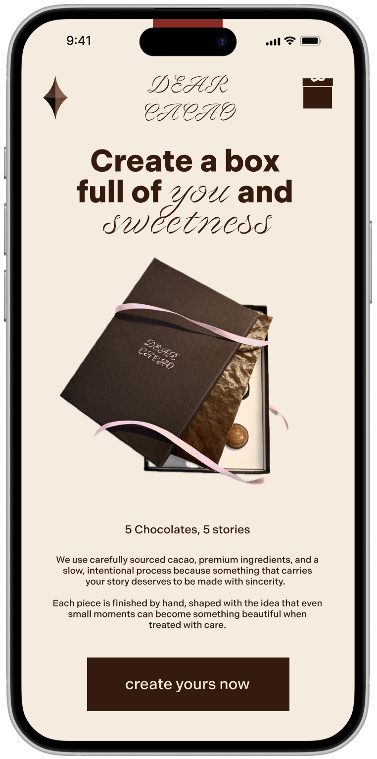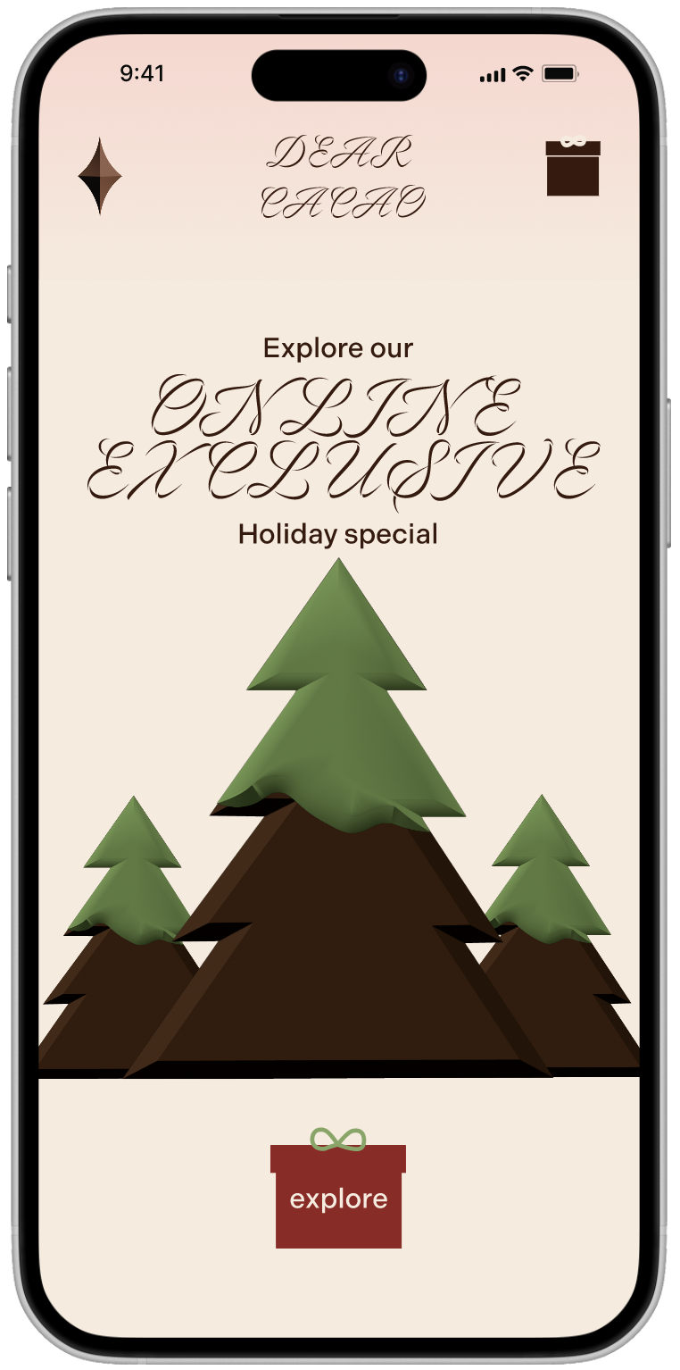 At Dear Cacao, instead of choosing flavors, users select emotions and meaningful moments, creating an intimate experience for both giver and receiver. The project extends across a cohesive brand system, including a website, app, packaging, a journal-style booklet, and seasonal items (calendar and tree ornament).